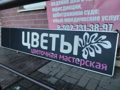 Светящаяся фасадная вывеска ЦВЕТЫ цветочная мастерская, бу. Лайтбокс покрыт чёрной и розовой плёнкой в металлическом каркасе.